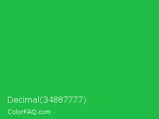 Decimal 34887777 Color is a normal green color and the nearest color is Wageningen Green #34b233. Hex code #20be45 and RGB value is rgb(32,190,69). In RGB color space, this color is composed of 13% red, 75% green, 27% blue, In CMYK color space, this color is composed of 83% cyan, 0% magenta, 64% yellow , 25% black , In HSL color space, this color has a hue angle of 134° , 71% saturation and 44% lightness.