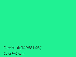 Decimal 34968146 Color is a normal green color and the nearest color is Medium Spring Green #00fa9a. Hex code #20f294 and RGB value is rgb(32,242,148). In RGB color space, this color is composed of 13% red, 95% green, 58% blue, In CMYK color space, this color is composed of 87% cyan, 0% magenta, 39% yellow , 5% black , In HSL color space, this color has a hue angle of 153° , 89% saturation and 54% lightness.