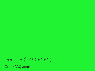 Decimal 34968585 Color is a normal green color and the nearest color is Neon Green #39ff14. Hex code #20f331 and RGB value is rgb(32,243,49). In RGB color space, this color is composed of 13% red, 95% green, 19% blue, In CMYK color space, this color is composed of 87% cyan, 0% magenta, 80% yellow , 5% black , In HSL color space, this color has a hue angle of 125° , 90% saturation and 54% lightness.