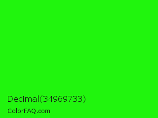 Decimal 34969733 Color is a normal green color and the nearest color is Neon Green #39ff14. Hex code #20f50d and RGB value is rgb(32,245,13). In RGB color space, this color is composed of 13% red, 96% green, 5% blue, In CMYK color space, this color is composed of 87% cyan, 0% magenta, 95% yellow , 4% black , In HSL color space, this color has a hue angle of 115° , 92% saturation and 51% lightness.