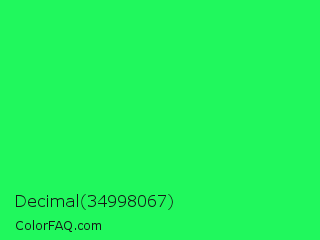 Decimal 34998067 Color is a normal green color and the nearest color is Malachite #0bda51. Hex code #20f85d and RGB value is rgb(32,248,93). In RGB color space, this color is composed of 13% red, 97% green, 36% blue, In CMYK color space, this color is composed of 87% cyan, 0% magenta, 63% yellow , 3% black , In HSL color space, this color has a hue angle of 137° , 94% saturation and 55% lightness.