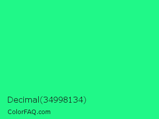 Decimal 34998134 Color is a normal green color and the nearest color is Spring Green #00ff7f. Hex code #20f888 and RGB value is rgb(32,248,136). In RGB color space, this color is composed of 13% red, 97% green, 53% blue, In CMYK color space, this color is composed of 87% cyan, 0% magenta, 45% yellow , 3% black , In HSL color space, this color has a hue angle of 149° , 94% saturation and 55% lightness.