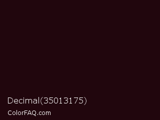 Decimal 35013175 Color is a almost black rose color and the nearest color is Night Rider #1f120f. Hex code #21060d and RGB value is rgb(33,6,13). In RGB color space, this color is composed of 13% red, 2% green, 5% blue, In CMYK color space, this color is composed of 0% cyan, 82% magenta, 61% yellow , 87% black , In HSL color space, this color has a hue angle of 344° , 69% saturation and 8% lightness.