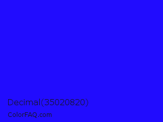 Decimal 35020820 Color is a normal indigo color and the nearest color is Bluebonnet #1c1cf0. Hex code #210cfe and RGB value is rgb(33,12,254). In RGB color space, this color is composed of 13% red, 5% green, 100% blue, In CMYK color space, this color is composed of 87% cyan, 95% magenta, 0% yellow , 0% black , In HSL color space, this color has a hue angle of 245° , 99% saturation and 52% lightness.