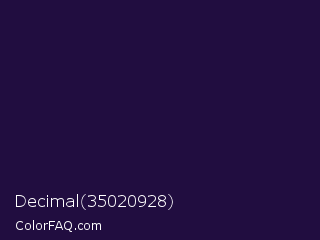 Decimal 35020928 Color is a very dark violet color and the nearest color is Violet #240a40. Hex code #210d40 and RGB value is rgb(33,13,64). In RGB color space, this color is composed of 13% red, 5% green, 25% blue, In CMYK color space, this color is composed of 48% cyan, 80% magenta, 0% yellow , 75% black , In HSL color space, this color has a hue angle of 264° , 66% saturation and 15% lightness.