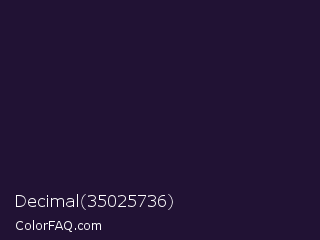 Decimal 35025736 Color is a very dark violet color and the nearest color is Haiti #1b1035. Hex code #211234 and RGB value is rgb(33,18,52). In RGB color space, this color is composed of 13% red, 7% green, 20% blue, In CMYK color space, this color is composed of 37% cyan, 65% magenta, 0% yellow , 80% black , In HSL color space, this color has a hue angle of 266° , 49% saturation and 14% lightness.