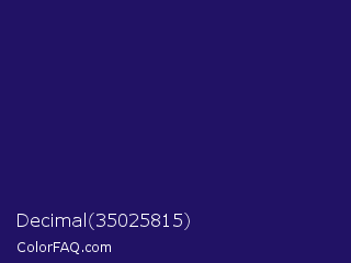 Decimal 35025815 Color is a dark indigo color and the nearest color is Lucky Point #1a1a68. Hex code #211265 and RGB value is rgb(33,18,101). In RGB color space, this color is composed of 13% red, 7% green, 40% blue, In CMYK color space, this color is composed of 67% cyan, 82% magenta, 0% yellow , 60% black , In HSL color space, this color has a hue angle of 251° , 70% saturation and 23% lightness.
