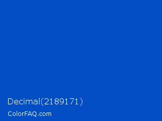 Decimal 2189171 Color is a normal blue color and the nearest color is Absolute Zero #0048ba. Hex code #034ec5 and RGB value is rgb(3,78,197). In RGB color space, this color is composed of 1% red, 31% green, 77% blue, In CMYK color space, this color is composed of 98% cyan, 60% magenta, 0% yellow , 23% black , In HSL color space, this color has a hue angle of 217° , 97% saturation and 39% lightness.