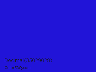 Decimal 35029028 Color is a normal indigo color and the nearest color is Interdimensional Blue #360ccc. Hex code #2114d8 and RGB value is rgb(33,20,216). In RGB color space, this color is composed of 13% red, 8% green, 85% blue, In CMYK color space, this color is composed of 85% cyan, 91% magenta, 0% yellow , 15% black , In HSL color space, this color has a hue angle of 244° , 83% saturation and 46% lightness.