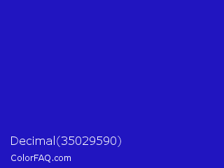 Decimal 35029590 Color is a normal indigo color and the nearest color is Interdimensional Blue #360ccc. Hex code #2115c0 and RGB value is rgb(33,21,192). In RGB color space, this color is composed of 13% red, 8% green, 75% blue, In CMYK color space, this color is composed of 83% cyan, 89% magenta, 0% yellow , 25% black , In HSL color space, this color has a hue angle of 244° , 80% saturation and 42% lightness.