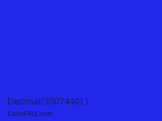 Decimal 35074401 Color is a normal blue color and the nearest color is Bluebonnet #1c1cf0. Hex code #2128e9 and RGB value is rgb(33,40,233). In RGB color space, this color is composed of 13% red, 16% green, 91% blue, In CMYK color space, this color is composed of 86% cyan, 83% magenta, 0% yellow , 9% black , In HSL color space, this color has a hue angle of 238° , 82% saturation and 52% lightness.