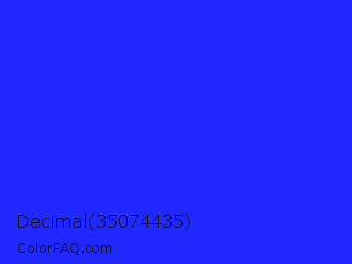 Decimal 35074435 Color is a normal blue color and the nearest color is Bluebonnet #1c1cf0. Hex code #2128ff and RGB value is rgb(33,40,255). In RGB color space, this color is composed of 13% red, 16% green, 100% blue, In CMYK color space, this color is composed of 87% cyan, 84% magenta, 0% yellow , 0% black , In HSL color space, this color has a hue angle of 238° , 100% saturation and 56% lightness.