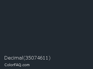 Decimal 35074611 Color is a very dark blue color and the nearest color is Charleston Green #232b2b. Hex code #212931 and RGB value is rgb(33,41,49). In RGB color space, this color is composed of 13% red, 16% green, 19% blue, In CMYK color space, this color is composed of 33% cyan, 16% magenta, 0% yellow , 81% black , In HSL color space, this color has a hue angle of 210° , 20% saturation and 16% lightness.