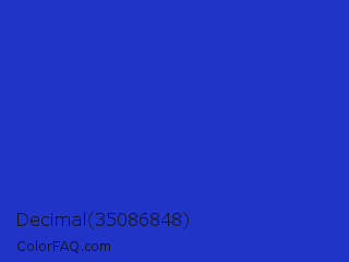 Decimal 35086848 Color is a normal blue color and the nearest color is Persian Blue #1c39bb. Hex code #2134c8 and RGB value is rgb(33,52,200). In RGB color space, this color is composed of 13% red, 20% green, 78% blue, In CMYK color space, this color is composed of 84% cyan, 74% magenta, 0% yellow , 22% black , In HSL color space, this color has a hue angle of 233° , 72% saturation and 46% lightness.