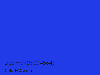 Decimal 35094564 Color is a normal blue color and the nearest color is Palatinate Blue #273be2. Hex code #213be8 and RGB value is rgb(33,59,232). In RGB color space, this color is composed of 13% red, 23% green, 91% blue, In CMYK color space, this color is composed of 86% cyan, 75% magenta, 0% yellow , 9% black , In HSL color space, this color has a hue angle of 232° , 81% saturation and 52% lightness.