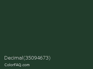 Decimal 35094673 Color is a very dark green color and the nearest color is Everglade #1c402e. Hex code #213c2b and RGB value is rgb(33,60,43). In RGB color space, this color is composed of 13% red, 24% green, 17% blue, In CMYK color space, this color is composed of 45% cyan, 0% magenta, 28% yellow , 76% black , In HSL color space, this color has a hue angle of 142° , 29% saturation and 18% lightness.