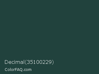 Decimal 35100229 Color is a very dark cyan color and the nearest color is Te Papa Green #1e433c. Hex code #21423d and RGB value is rgb(33,66,61). In RGB color space, this color is composed of 13% red, 26% green, 24% blue, In CMYK color space, this color is composed of 50% cyan, 0% magenta, 8% yellow , 74% black , In HSL color space, this color has a hue angle of 171° , 33% saturation and 19% lightness.