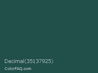 Decimal 35137925 Color is a very dark cyan color and the nearest color is Plantation #27504b. Hex code #214f49 and RGB value is rgb(33,79,73). In RGB color space, this color is composed of 13% red, 31% green, 29% blue, In CMYK color space, this color is composed of 58% cyan, 0% magenta, 8% yellow , 69% black , In HSL color space, this color has a hue angle of 172° , 41% saturation and 22% lightness.