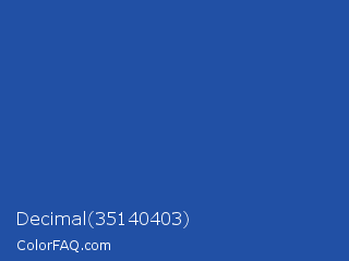 Decimal 35140403 Color is a normal blue color and the nearest color is Fun Blue #1959a8. Hex code #2150a5 and RGB value is rgb(33,80,165). In RGB color space, this color is composed of 13% red, 31% green, 65% blue, In CMYK color space, this color is composed of 80% cyan, 52% magenta, 0% yellow , 35% black , In HSL color space, this color has a hue angle of 219° , 67% saturation and 39% lightness.