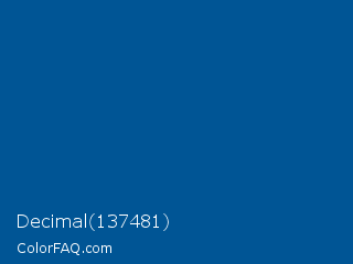 Decimal 137481 Color is a dark blue color and the nearest color is Medium Electric Blue #035096. Hex code #005595 and RGB value is rgb(0,85,149). In RGB color space, this color is composed of 0% red, 33% green, 58% blue, In CMYK color space, this color is composed of 100% cyan, 43% magenta, 0% yellow , 42% black , In HSL color space, this color has a hue angle of 206° , 100% saturation and 29% lightness.
