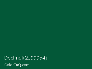Decimal 2199954 Color is a very dark green color and the nearest color is Sacramento State Green #00563f. Hex code #035838 and RGB value is rgb(3,88,56). In RGB color space, this color is composed of 1% red, 35% green, 22% blue, In CMYK color space, this color is composed of 97% cyan, 0% magenta, 36% yellow , 65% black , In HSL color space, this color has a hue angle of 157° , 93% saturation and 18% lightness.