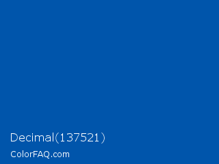 Decimal 137521 Color is a normal blue color and the nearest color is Endeavour #0056a7. Hex code #0055ab and RGB value is rgb(0,85,171). In RGB color space, this color is composed of 0% red, 33% green, 67% blue, In CMYK color space, this color is composed of 100% cyan, 50% magenta, 0% yellow , 33% black , In HSL color space, this color has a hue angle of 210° , 100% saturation and 34% lightness.