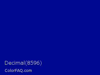 Decimal 8596 Color is a dark blue color and the nearest color is Dark Blue #00008b. Hex code #000892 and RGB value is rgb(0,8,146). In RGB color space, this color is composed of 0% red, 3% green, 57% blue, In CMYK color space, this color is composed of 100% cyan, 95% magenta, 0% yellow , 43% black , In HSL color space, this color has a hue angle of 237° , 100% saturation and 29% lightness.
