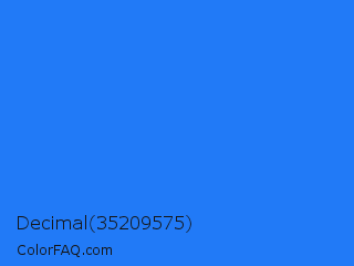 Decimal 35209575 Color is a normal blue color and the nearest color is Blue Crayola #1f75fe. Hex code #217af7 and RGB value is rgb(33,122,247). In RGB color space, this color is composed of 13% red, 48% green, 97% blue, In CMYK color space, this color is composed of 87% cyan, 51% magenta, 0% yellow , 3% black , In HSL color space, this color has a hue angle of 215° , 93% saturation and 55% lightness.