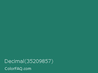 Decimal 35209857 Color is a normal cyan color and the nearest color is Genoa #15736b. Hex code #217b69 and RGB value is rgb(33,123,105). In RGB color space, this color is composed of 13% red, 48% green, 41% blue, In CMYK color space, this color is composed of 73% cyan, 0% magenta, 15% yellow , 52% black , In HSL color space, this color has a hue angle of 168° , 58% saturation and 31% lightness.