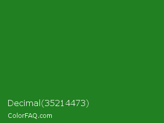 Decimal 35214473 Color is a normal green color and the nearest color is Forest Green #228b22. Hex code #218021 and RGB value is rgb(33,128,33). In RGB color space, this color is composed of 13% red, 50% green, 13% blue, In CMYK color space, this color is composed of 74% cyan, 0% magenta, 74% yellow , 50% black , In HSL color space, this color has a hue angle of 120° , 59% saturation and 32% lightness.