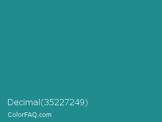 Decimal 35227249 Color is a normal cyan color and the nearest color is Lochinvar #2c8c84. Hex code #218c8f and RGB value is rgb(33,140,143). In RGB color space, this color is composed of 13% red, 55% green, 56% blue, In CMYK color space, this color is composed of 77% cyan, 2% magenta, 0% yellow , 44% black , In HSL color space, this color has a hue angle of 182° , 63% saturation and 35% lightness.
