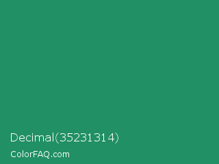 Decimal 35231314 Color is a normal green color and the nearest color is Eucalyptus #278a5b. Hex code #219064 and RGB value is rgb(33,144,100). In RGB color space, this color is composed of 13% red, 56% green, 39% blue, In CMYK color space, this color is composed of 77% cyan, 0% magenta, 31% yellow , 44% black , In HSL color space, this color has a hue angle of 156° , 63% saturation and 35% lightness.