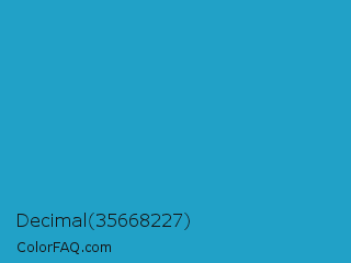 Decimal 35668227 Color is a normal blue color and the nearest color is Pacific Blue #1ca9c9. Hex code #21a1c7 and RGB value is rgb(33,161,199). In RGB color space, this color is composed of 13% red, 63% green, 78% blue, In CMYK color space, this color is composed of 83% cyan, 19% magenta, 0% yellow , 22% black , In HSL color space, this color has a hue angle of 194° , 72% saturation and 45% lightness.