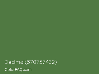 Decimal 570757432 Color is a normal green color and the nearest color is Fern Green #4f7942. Hex code #507942 and RGB value is rgb(80,121,66). In RGB color space, this color is composed of 31% red, 47% green, 26% blue, In CMYK color space, this color is composed of 34% cyan, 0% magenta, 45% yellow , 53% black , In HSL color space, this color has a hue angle of 105° , 29% saturation and 37% lightness.