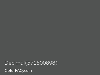 Decimal 571500898 Color is a normal green color and the nearest color is Davys Grey #555555. Hex code #515352 and RGB value is rgb(81,83,82). In RGB color space, this color is composed of 32% red, 33% green, 32% blue, In CMYK color space, this color is composed of 2% cyan, 0% magenta, 1% yellow , 67% black , In HSL color space, this color has a hue angle of 150° , 1% saturation and 32% lightness.