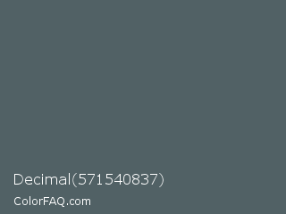Decimal 571540837 Color is a normal cyan color and the nearest color is Stormcloud #4f666a. Hex code #516165 and RGB value is rgb(81,97,101). In RGB color space, this color is composed of 32% red, 38% green, 40% blue, In CMYK color space, this color is composed of 20% cyan, 4% magenta, 0% yellow , 60% black , In HSL color space, this color has a hue angle of 192° , 11% saturation and 36% lightness.