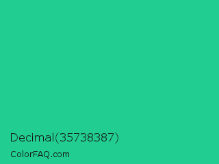 Decimal 35738387 Color is a normal green color and the nearest color is Shamrock #33cc99. Hex code #21cd91 and RGB value is rgb(33,205,145). In RGB color space, this color is composed of 13% red, 80% green, 57% blue, In CMYK color space, this color is composed of 84% cyan, 0% magenta, 29% yellow , 20% black , In HSL color space, this color has a hue angle of 159° , 72% saturation and 47% lightness.