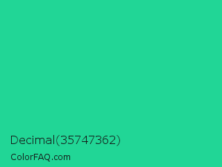 Decimal 35747362 Color is a normal green color and the nearest color is Shamrock #33cc99. Hex code #21d696 and RGB value is rgb(33,214,150). In RGB color space, this color is composed of 13% red, 84% green, 59% blue, In CMYK color space, this color is composed of 85% cyan, 0% magenta, 30% yellow , 16% black , In HSL color space, this color has a hue angle of 159° , 73% saturation and 48% lightness.