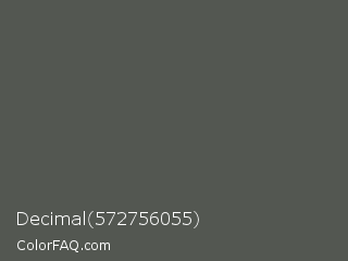Decimal 572756055 Color is a normal green color and the nearest color is Davys Grey #555555. Hex code #535751 and RGB value is rgb(83,87,81). In RGB color space, this color is composed of 33% red, 34% green, 32% blue, In CMYK color space, this color is composed of 5% cyan, 0% magenta, 7% yellow , 66% black , In HSL color space, this color has a hue angle of 100° , 4% saturation and 33% lightness.
