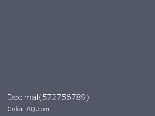 Decimal 572756789 Color is a normal blue color and the nearest color is Scarpa Flow #585562. Hex code #535867 and RGB value is rgb(83,88,103). In RGB color space, this color is composed of 33% red, 35% green, 40% blue, In CMYK color space, this color is composed of 19% cyan, 15% magenta, 0% yellow , 60% black , In HSL color space, this color has a hue angle of 225° , 11% saturation and 36% lightness.