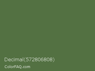 Decimal 572806808 Color is a normal green color and the nearest color is Chalet Green #516e3d. Hex code #537142 and RGB value is rgb(83,113,66). In RGB color space, this color is composed of 33% red, 44% green, 26% blue, In CMYK color space, this color is composed of 27% cyan, 0% magenta, 42% yellow , 56% black , In HSL color space, this color has a hue angle of 98° , 26% saturation and 35% lightness.
