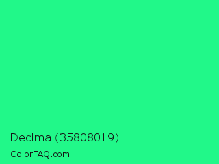 Decimal 35808019 Color is a normal green color and the nearest color is Spring Green #00ff7f. Hex code #21f889 and RGB value is rgb(33,248,137). In RGB color space, this color is composed of 13% red, 97% green, 54% blue, In CMYK color space, this color is composed of 87% cyan, 0% magenta, 45% yellow , 3% black , In HSL color space, this color has a hue angle of 149° , 94% saturation and 55% lightness.