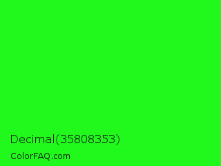 Decimal 35808353 Color is a normal green color and the nearest color is Neon Green #39ff14. Hex code #21f91d and RGB value is rgb(33,249,29). In RGB color space, this color is composed of 13% red, 98% green, 11% blue, In CMYK color space, this color is composed of 87% cyan, 0% magenta, 88% yellow , 2% black , In HSL color space, this color has a hue angle of 119° , 95% saturation and 55% lightness.