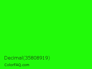 Decimal 35808919 Color is a normal green color and the nearest color is Neon Green #39ff14. Hex code #21fa09 and RGB value is rgb(33,250,9). In RGB color space, this color is composed of 13% red, 98% green, 4% blue, In CMYK color space, this color is composed of 87% cyan, 0% magenta, 96% yellow , 2% black , In HSL color space, this color has a hue angle of 114° , 96% saturation and 51% lightness.