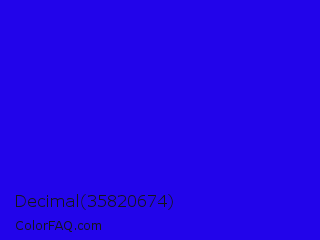 Decimal 35820674 Color is a normal indigo color and the nearest color is Bluebonnet #1c1cf0. Hex code #2204ea and RGB value is rgb(34,4,234). In RGB color space, this color is composed of 13% red, 2% green, 92% blue, In CMYK color space, this color is composed of 85% cyan, 98% magenta, 0% yellow , 8% black , In HSL color space, this color has a hue angle of 248° , 97% saturation and 47% lightness.