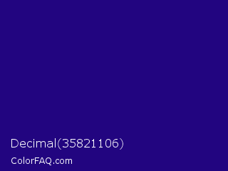Decimal 35821106 Color is a dark indigo color and the nearest color is Deep Blue #220878. Hex code #220580 and RGB value is rgb(34,5,128). In RGB color space, this color is composed of 13% red, 2% green, 50% blue, In CMYK color space, this color is composed of 73% cyan, 96% magenta, 0% yellow , 50% black , In HSL color space, this color has a hue angle of 254° , 92% saturation and 26% lightness.