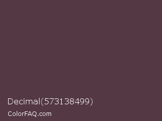 Decimal 573138499 Color is a dark rose color and the nearest color is Matterhorn #4e3b41. Hex code #543843 and RGB value is rgb(84,56,67). In RGB color space, this color is composed of 33% red, 22% green, 26% blue, In CMYK color space, this color is composed of 0% cyan, 33% magenta, 20% yellow , 67% black , In HSL color space, this color has a hue angle of 336° , 20% saturation and 27% lightness.