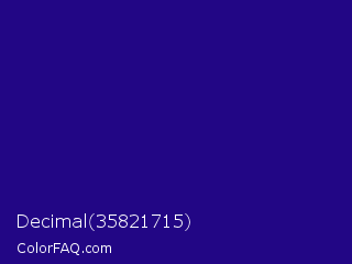 Decimal 35821715 Color is a dark indigo color and the nearest color is Deep Blue #220878. Hex code #220685 and RGB value is rgb(34,6,133). In RGB color space, this color is composed of 13% red, 2% green, 52% blue, In CMYK color space, this color is composed of 74% cyan, 95% magenta, 0% yellow , 48% black , In HSL color space, this color has a hue angle of 253° , 91% saturation and 27% lightness.
