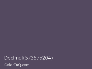 Decimal 573575204 Color is a normal violet color and the nearest color is Mulled Wine #4e4562. Hex code #544960 and RGB value is rgb(84,73,96). In RGB color space, this color is composed of 33% red, 29% green, 38% blue, In CMYK color space, this color is composed of 13% cyan, 24% magenta, 0% yellow , 62% black , In HSL color space, this color has a hue angle of 269° , 14% saturation and 33% lightness.