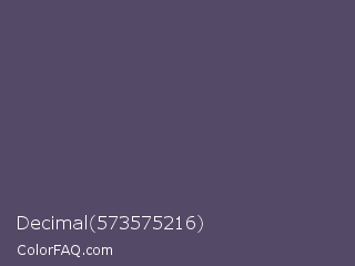 Decimal 573575216 Color is a normal violet color and the nearest color is Mulled Wine #4e4562. Hex code #544966 and RGB value is rgb(84,73,102). In RGB color space, this color is composed of 33% red, 29% green, 40% blue, In CMYK color space, this color is composed of 18% cyan, 28% magenta, 0% yellow , 60% black , In HSL color space, this color has a hue angle of 263° , 17% saturation and 34% lightness.